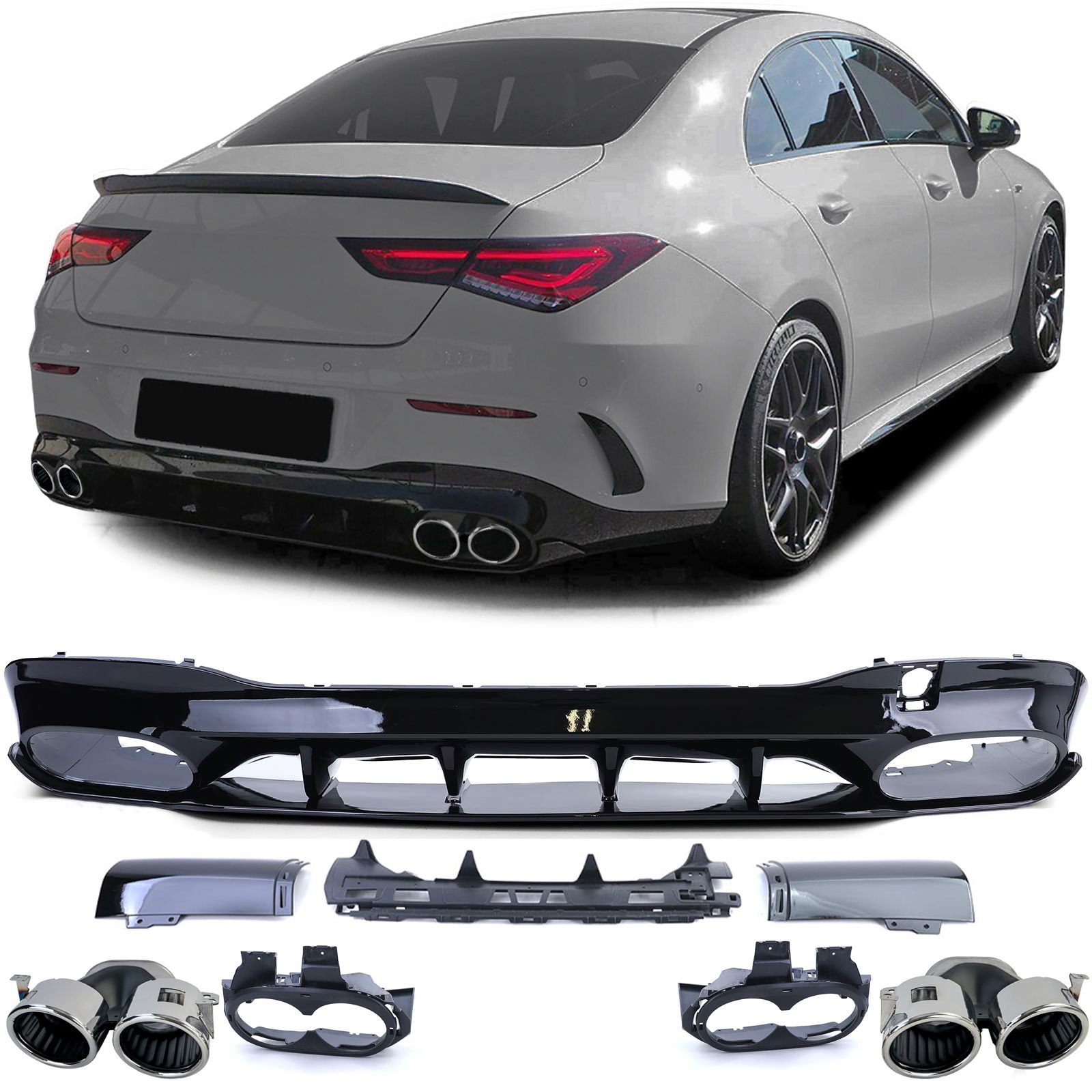Pasirinkite Tuning AMG A35 style galinis difuzorius juodas blizgus su juodais blizgiais antgaliais, skirtas MB CLA C118, W118 modeliams nuo 19-23m. Išmetimas 0-0. Tik AMG bamperiui. €0.00