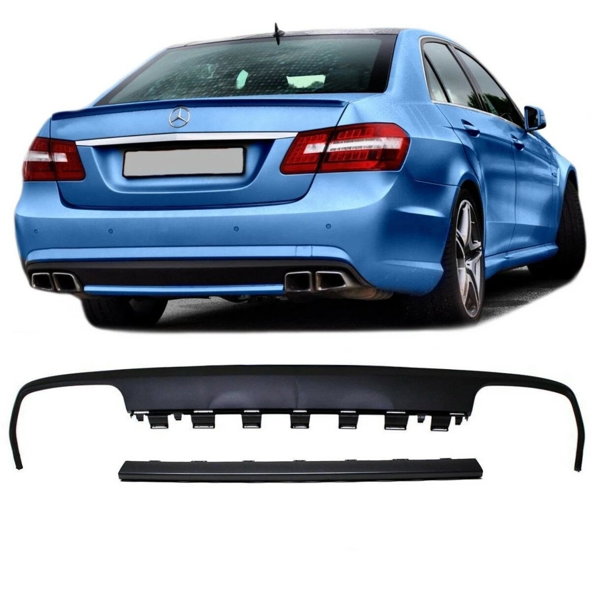 Tuning galinis difuzorius skirtas Mercedes E Klasės W212 modeliams nuo 09-13m. Tinka AMG serijos bamperiui. Išmetimas platus 00-00. Be apatinės apdailos. Juodas matinis. €109.00