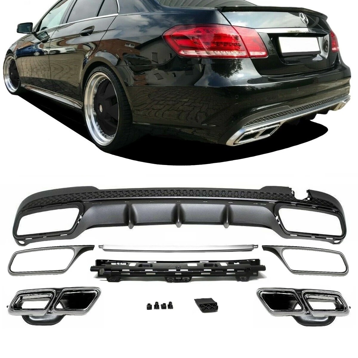 AMG E63 style galinis bamperis su galiniu difuzoriumi skirtas sedanui, MB E Klasės W212 modeliui nuo 09-13m. Made in Taiwan. Su PDC skylėmis. €380.00