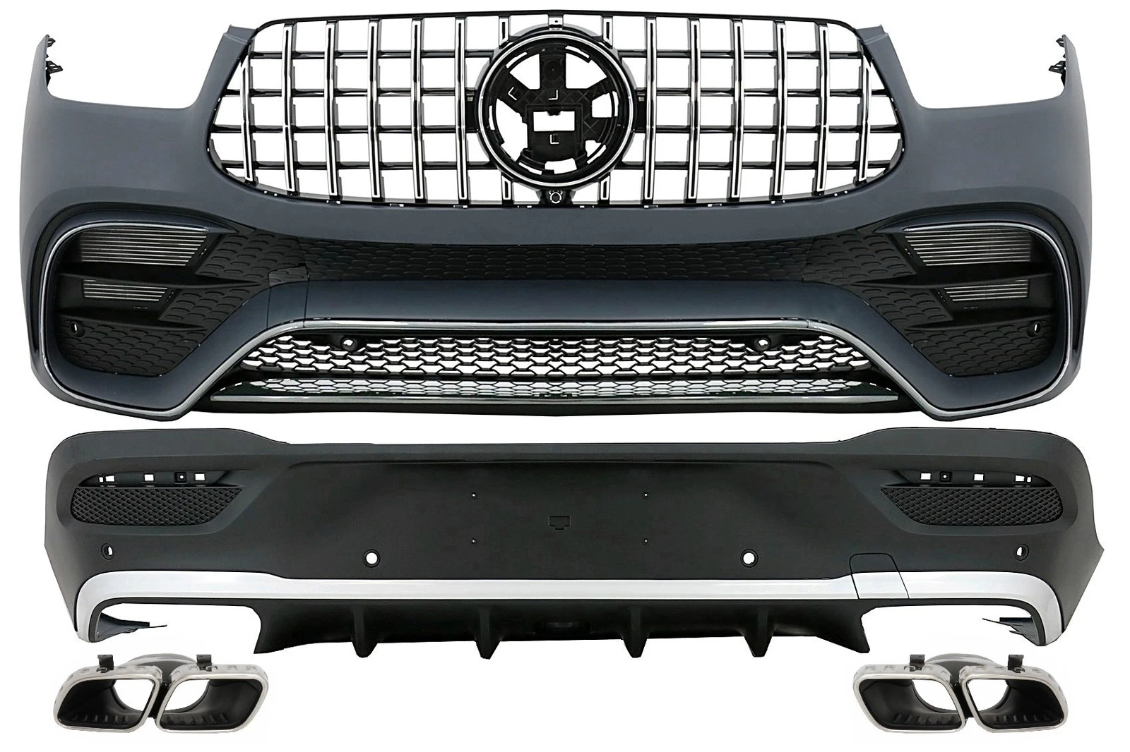 AMG63 style priekinis bamperis su grotelėmis skirtas MB GLE V167, W167 SUV, GLE Cuope C167 modeliams nuo 19-23m. Komplektacija, su sidabro spalvos apdailomis. €750.00