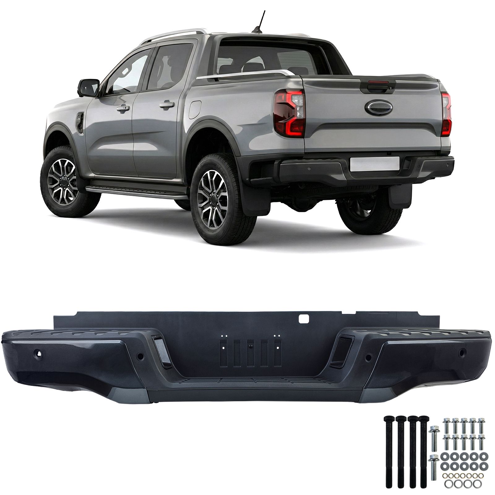 Galinio bamperio komplektas skirtas Ford Range T9 modeliui nuo 23m. Su PDC skylėmis. Numerio apšvietimu. Metaliniais laikikliais. Juodas matinis. €535.00