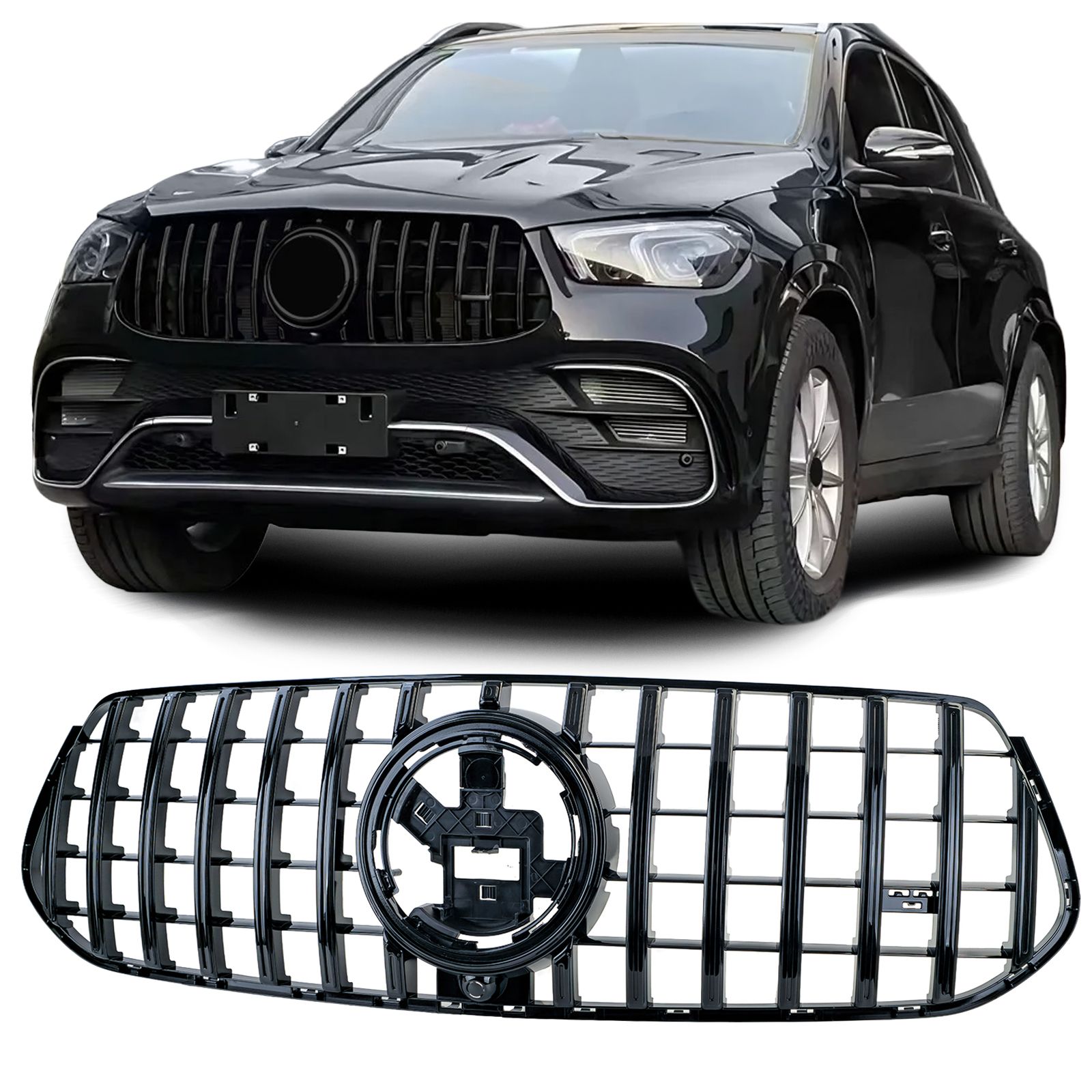 Sport Panamericana GT grotelės GLE C167 Cuope modeliui nuo 19-23m. Tinka AMG bamperiui. Juodos blizgios. Su kameros skyle.