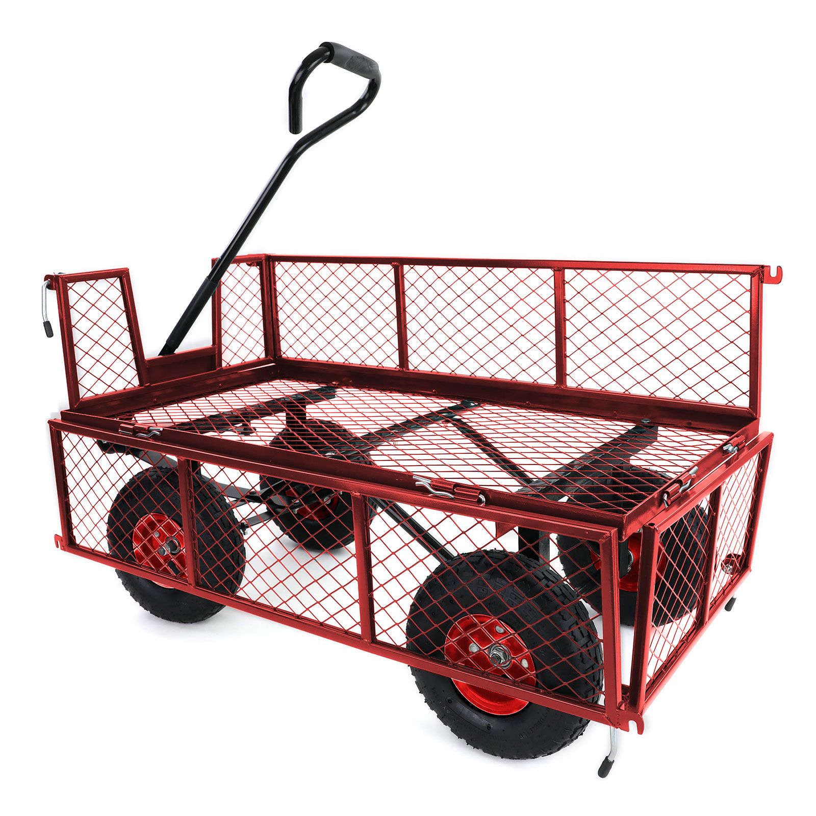 • Klappomos šoninės sienelės – labai patogios, kai reikia lengvai krauti ir iškrauti krovinius. Jos taip pat greitai nuimamos, todėl vežimėlis tampa dar kompaktiškesnis ir patogesnis sandėliavimui.
