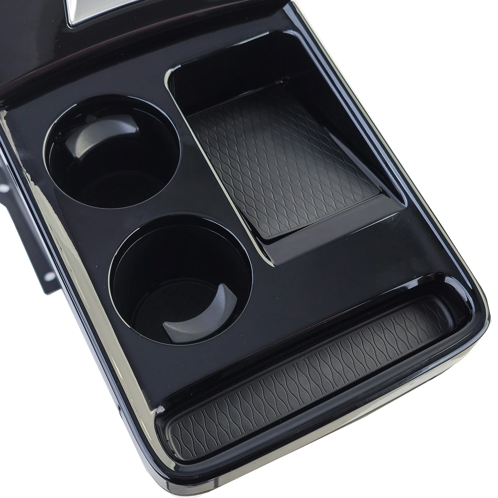 Konsolėje taip pat yra du puodelių laikikliai (priekyje ir gale) bei telefono dėklas su belaidžiu įkrovimu, kad jūsų įrenginiai būtų saugiai padėti ir visada įkrauti.